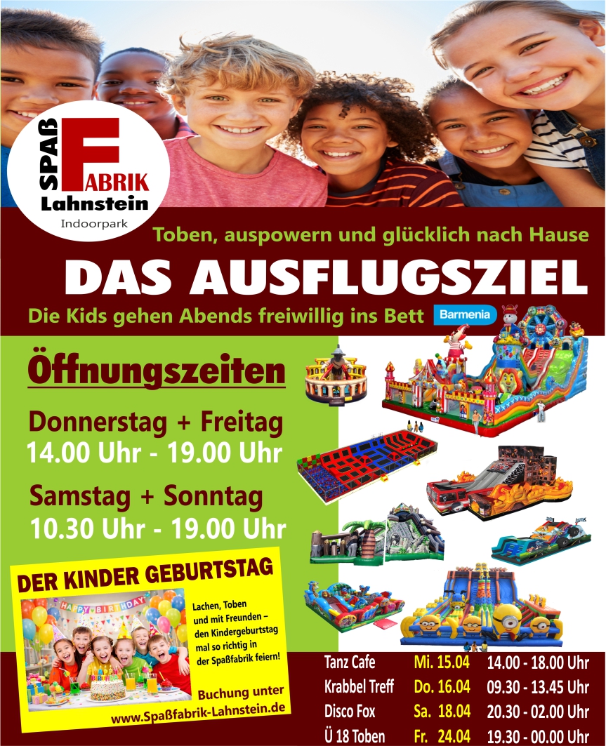 +++ Die Spaßfabrik Lahnstein ist Dienstag bis Freitag von 8:00 bis 12:00 Uhr telefonisch erreichbar unter 02621/6969754 oder schreiben Sie eine E-Mail an Spassfabrik.Lahnstein@web.de +++ Die Spaßfabrik Lahnstein ist Dienstag bis Freitag von 8:00 bis 12:00 Uhr telefonisch erreichbar unter 02621/6969754 oder schreiben Sie eine E-Mail an Spassfabrik.Lahnstein@web.de +++
